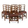 the pierced ladder backs with shaped top rails above oxblood leather stuffover seats, raised on channel moulded straight square chamfered legs joined by H stretchers (6)
