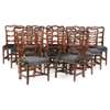 comprising twelve side chairs and a pair of armchairs, with pierced ladder backs above horsehair stuff-over seats, raised on square tapered legs joined by peripheral stretchers (14)