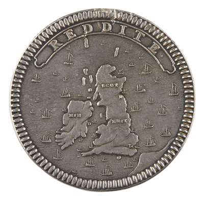 Reverse; map of Great Britain and Ireland with ships around and motto REDDITE in banner above