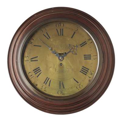 the brass dial with Roman numerals, inscribed CHURCH/ NORWICH, in a moulded mahogany frame