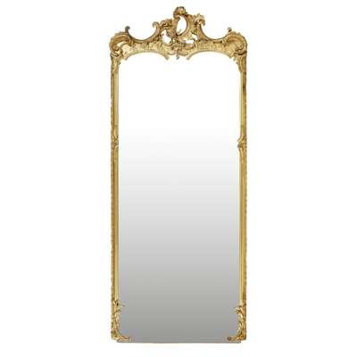 in the rococo style, the rectangular mirror plates in moulded frames with C and foliate scrolls surmounted by pierced and carved C scroll and foliate crestings (2)