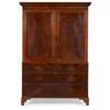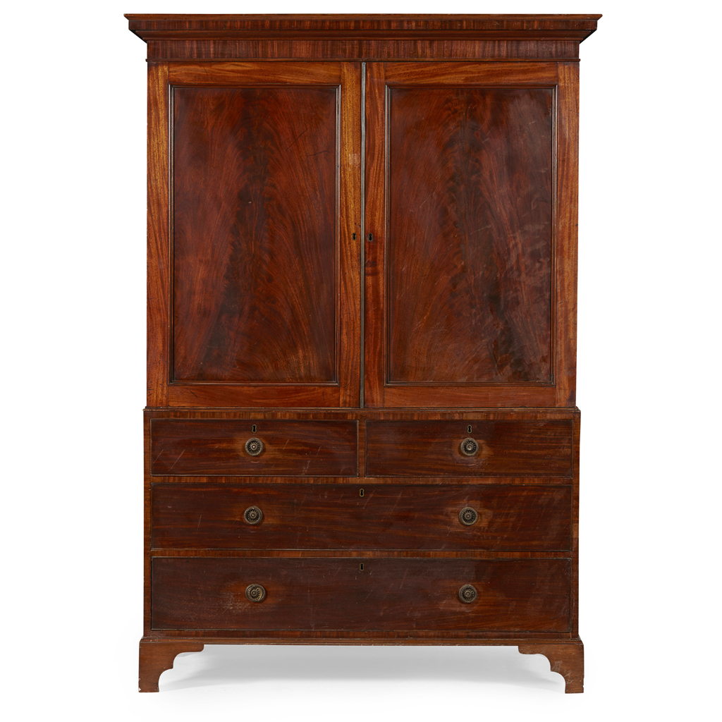 the plain moulded cornice over a pair of panelled doors opening to hanging space; the base with two short over two long drawers, raised on shaped bracket feet