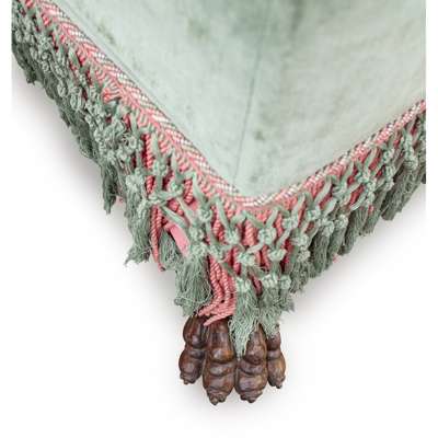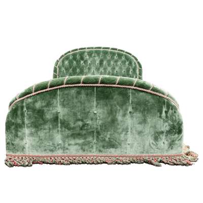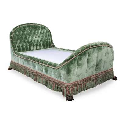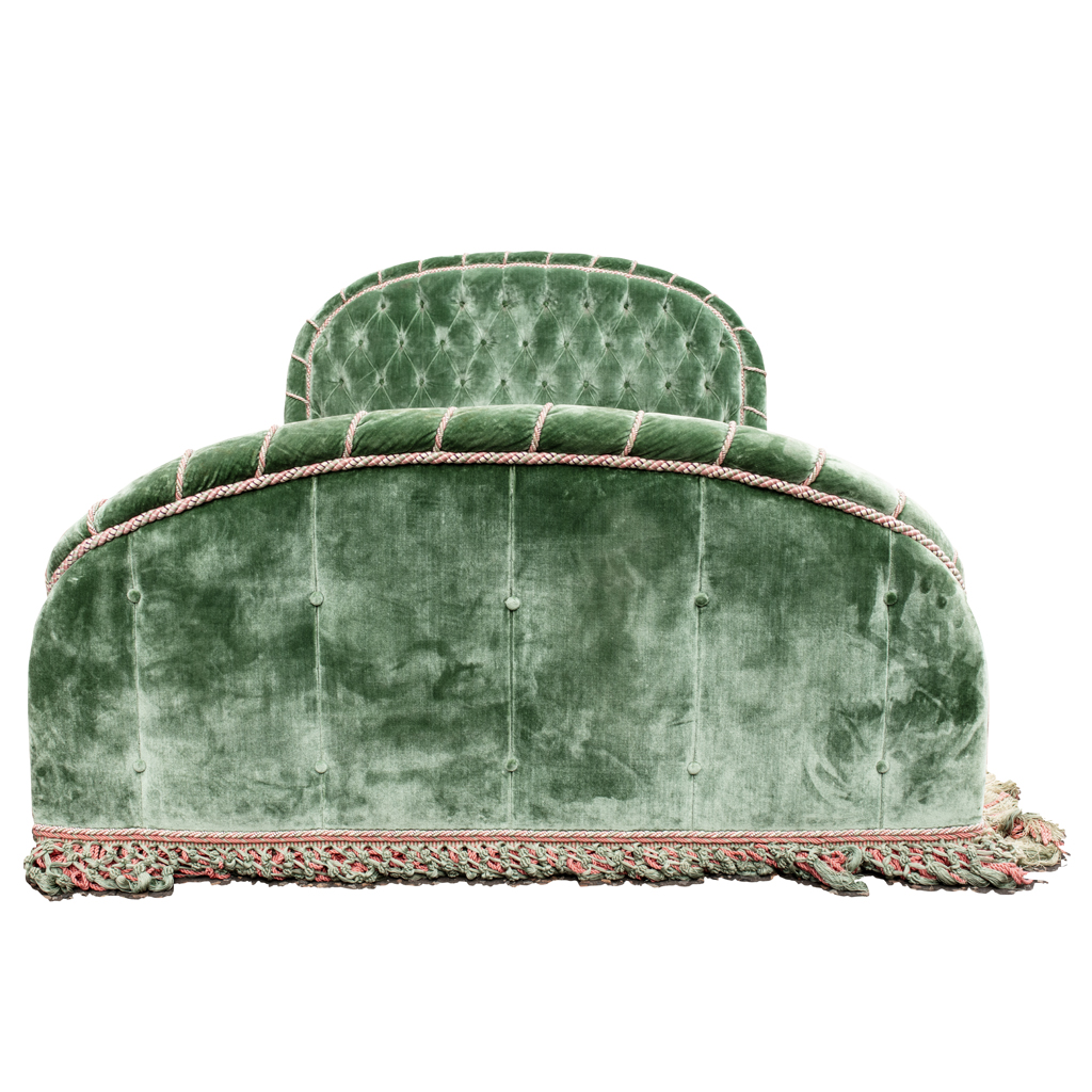 with an arched upholstered headboard, footboard and rails, covered in buttoned green velvet with pink and green tassle trimming, raised on carved paw feet; with a sprung platform base