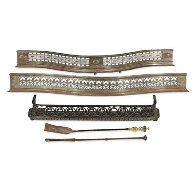 the fenders of serpentine outline with pierced panel fronts; together with an ASSOCIATED CAST IRON AND STEEL POKER AND STEEL AND BRASS SHOVEL, 72cm long; and a VICTORIAN CAST IRON FENDER, with a pierced scroll front panel 95cm long (5)
