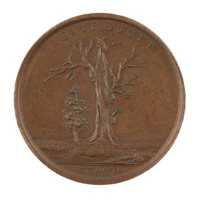 Reverse; stricken oak with shoots appearing from base with REVIRESCIT above and 1750 in exergue