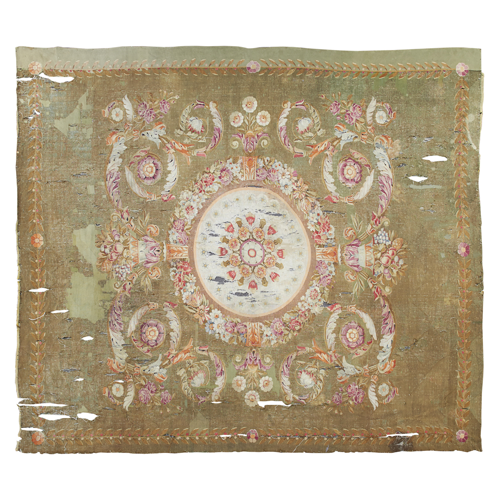 the olive green field with central cream medallion surrounded by foliate scrolls, laurel line borders (worn)