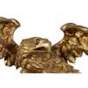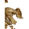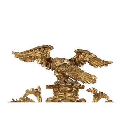 the convex mirror plate in an ebonised slip and moulded frame with ball mounts, surmounted by an eagle and rockwork cresting flanked by foliate scrolls and flower heads, with four scrolling candle arms, over oak leaf and acorn boughs centred by a large shell pendant finial