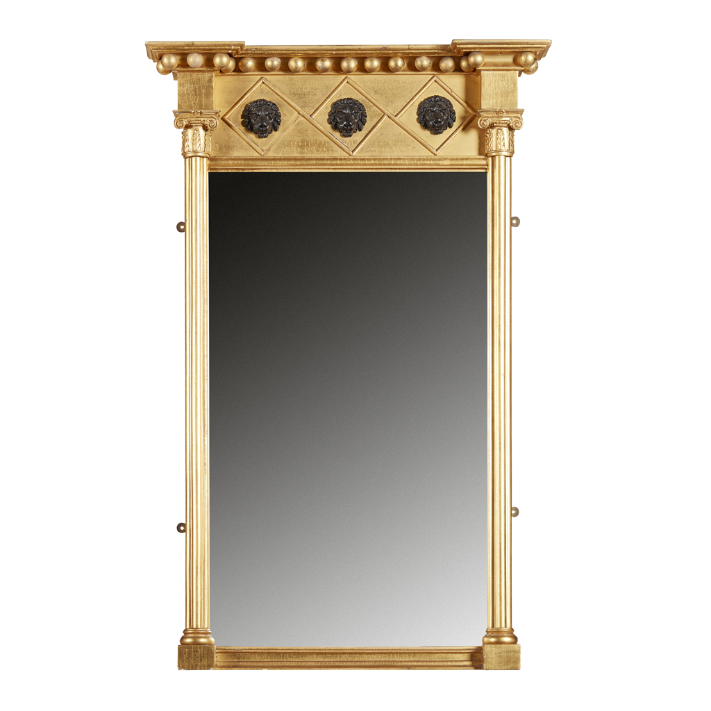 the inverted breakfront cornice with ball mounts above a frieze with ebonised lions' masks, over rectangular mirror plate, flanked reeded columns with foliate capitals