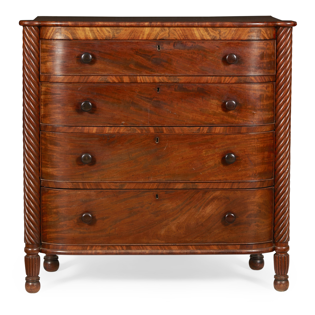 the slight bowfront top with outset rounded corners above four long graduated drawers flanked by spiral carved pilasters, raised on reeded and turned feet