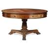 the circular top with a tooled red leather insert and reeded edge, above a frieze fitted with four real and four dummy drawers, on a lobed and reeded column support and triform base, raised on lotus carved paw feet with brass castors