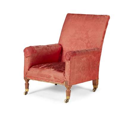 the square back above a deep seat and low scroll arms, raised on turned and tapered oak legs with brass caps and castors, in distressed red silk upholstery