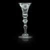 the trumpet bowl engraved with displayed rose head flanked by a single opening rose bud, onto a compressed and tapered knop with eight tear-drop air bubbles, all raised on a short stem with swollen central knop to a domed circular foot with folded rim