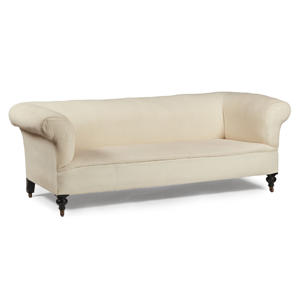 with low upholstered back and scrolled arms, raised on turned ebonised legs with ceramic castors