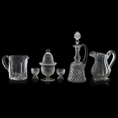 comprising two water jugs, the first of grey lead glass, with ribbed-cut neck and panelled body, 20cm high; the second with large thumb-cut panels and a star-cut base, 15.5cm high; a bell-shaped wine decanter and stopper, 34cm high; a bonbonniere and cover, with strawberry-cut bands, 21.5cm; and a pair of small salts, on square feet, 7.5cm high (6)