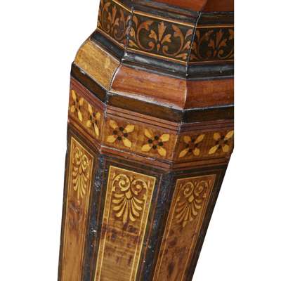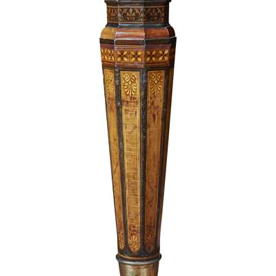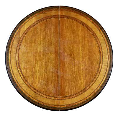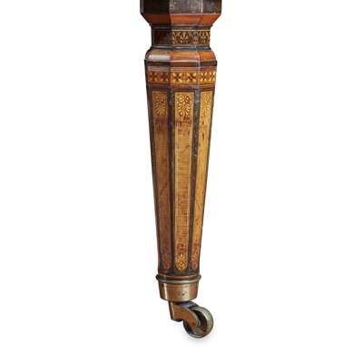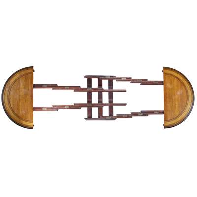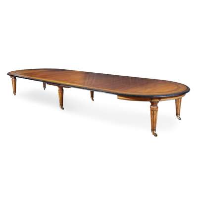 Note: The present dining table, of exceptional quality and design, is most likely the work of the pre-eminent London furniture maker Jackson and Graham. Constructed from an array of exotic hardwoods chosen for their contrasting colours and grains, and banded with ebonised moulding, it relies on decorative motifs consistent with the designs of Owen Jones, whose 'The Grammar of Ornament' was a seminal manual for the decorative arts from its publication in 1856.Owens worked closely with the firm, influencing their work with innovative designs, and even designing their shop on Oxford Street in London. Their clients included Queen Victoria, Napoleon III, the Sultan of the Ottoman Empire, the Grand Khedive at Cairo, and the Royal Palace in Siam, and would have appealed to the Victorian industrialists and merchants to furnish their homes.
