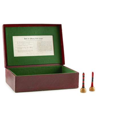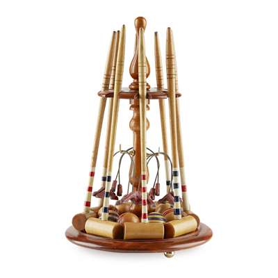 comprising a stained mahogany stand fitted with six hoops, eight balls and eight mallets, with two end posts and four cast iron table clips, in a red leather-covered box with paper trade label