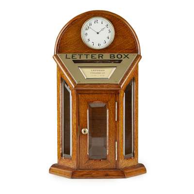 the arched top fitted with a circular clock with white enamelled dial, above a sloped top with brass letterplate plaque engraved LETTERS, over bevel glazed, canted sides and a single door, on a moulded base