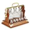the handle marked THE TANTALUS and BETJEMANN'S/ PATENT 43897/ LONDON, with three squared glass decanters with facetted knop stoppers, and twelve liqueur/shot glasses