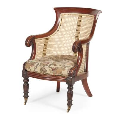 the caned curved back and seat in a lotus carved frame, raised on lotus carved legs with brass caps and castors
