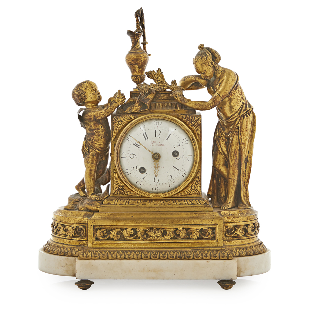 the circular white enamel dial with Arabic chapters and two winding holes, signed Lochon/ A PARIS, in a squared pedestal case flanked by figures of Cupid and Psyche and surmounted by an urn, on a shaped oval white marble base with toupie feet, the eight day movement striking a bell