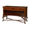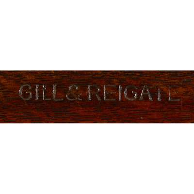 the rectangular top with featherbanding above three short drawers over an open recess with moulded fore-edge, raised on leaf carved cabriole legs with scroll brackets and joined by a wavy stretcher, the drawer stamped 'GILL & REIGATE'