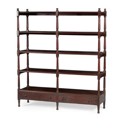with five rectangular tiers raised and divided by ring turned supports above a base with two short drawers, on short turned feet