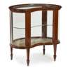 the reniform shaped glazed top above a convex glazed door and conforming sides enclosing a glass shelf interior raised on square tapered legs ending in spade feet with brass castors