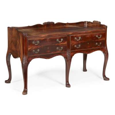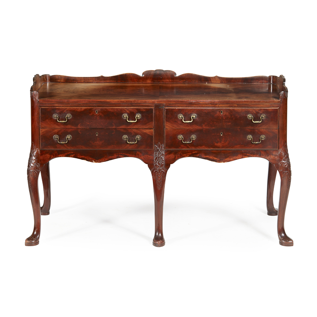 the rectangular top with a shaped three-quarter gallery, above two pairs of short drawers, raised on cabriole legs carved with pointed pad feet, stamped in the drawer