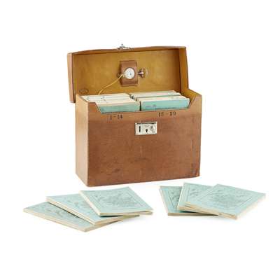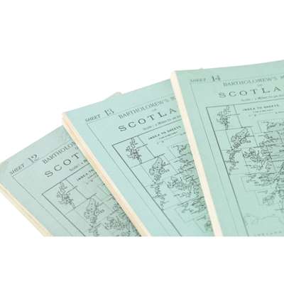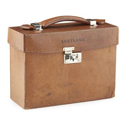 comprising twenty-nine Bartholomew's maps of Scotland, in a leather travelling case embossed SCOTLAND with retailer's stamp and a chrome map measurer