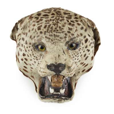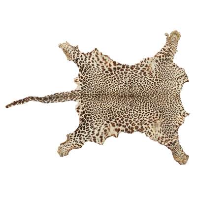 the head with glass eyes, some whiskers, open mouth and teeth, 19.5cm high; the separate leopard skin rug, with some claws, 190cm long (2)