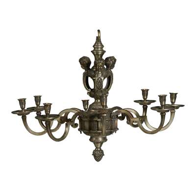 the central baluster stem surmounted by an urn with three Bacchic head finials, and issuing eight scrolled candle arms and a foliate pendant finial