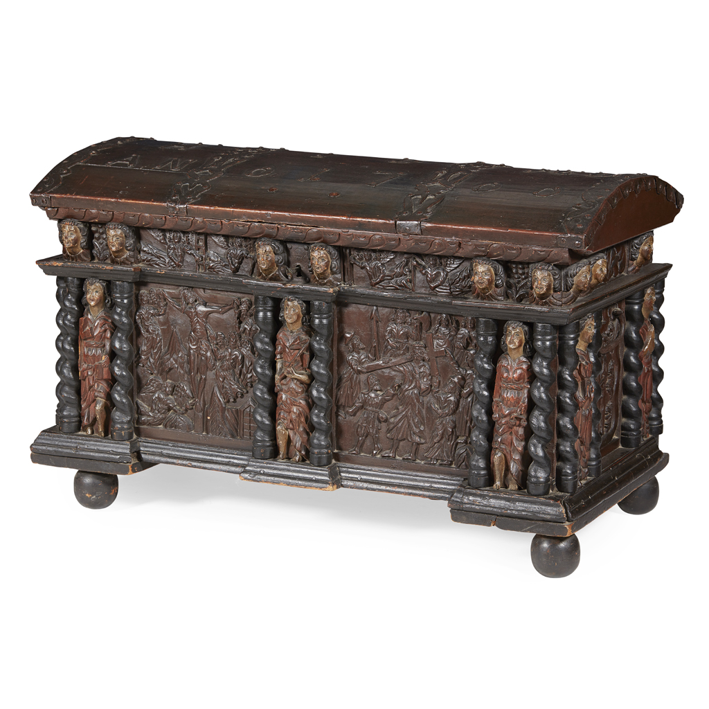 the domed cover with pierced iron strap hinges and dated FIS ID ANO 1700 with initials HH and M ME B, above a frieze carved with seraphim and cherubim over a double panel front carved with scenes of the Crucifixion, flanked and divided by carved saints and spiral columns, raised on late bun feet