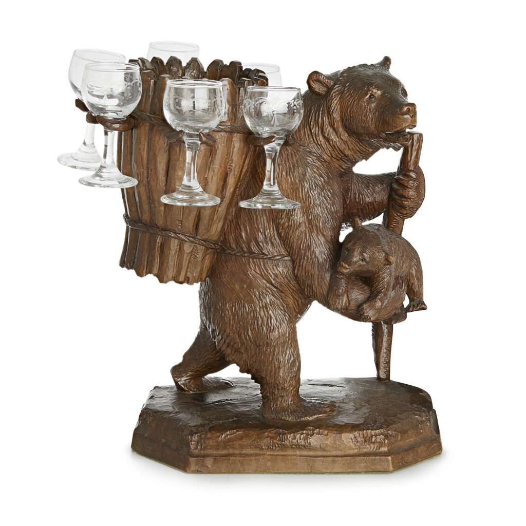 carved as a walking bear clutching a cub, with an open basket on his back for a decanter, fitted with six acid-etched drinking glasses, on a canted base