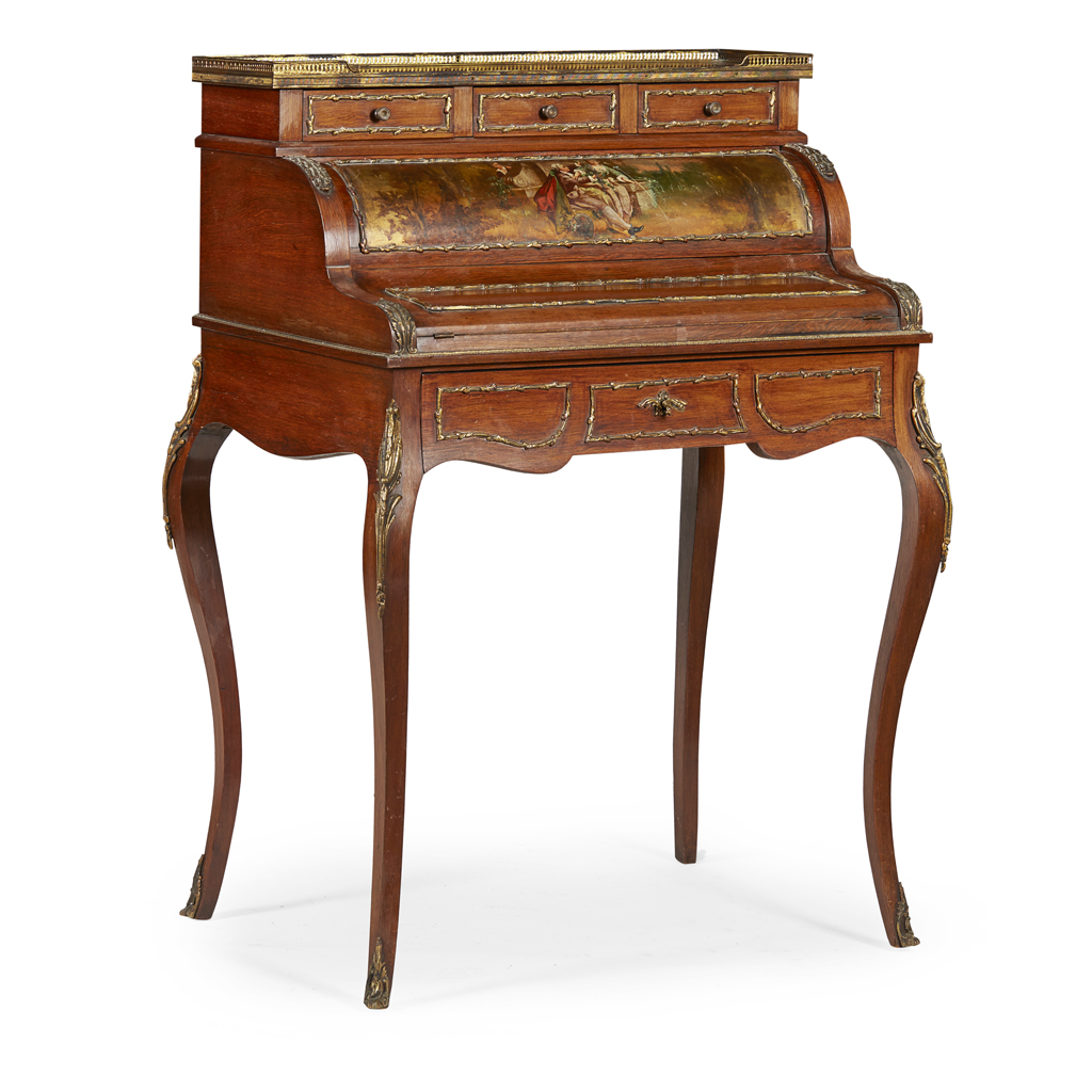 the superstructure with a pierced brass gallery and three short drawers, above a roll top cover with a Vernis Martin panel depicting a lovers' tryst, opening to a fold-out leather writing surface and further small drawers over a long frieze drawer, raised on cabriole legs with gilt metal mounts