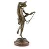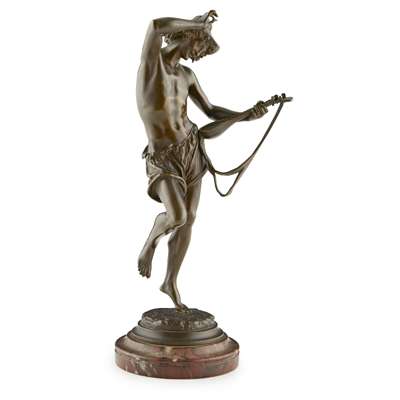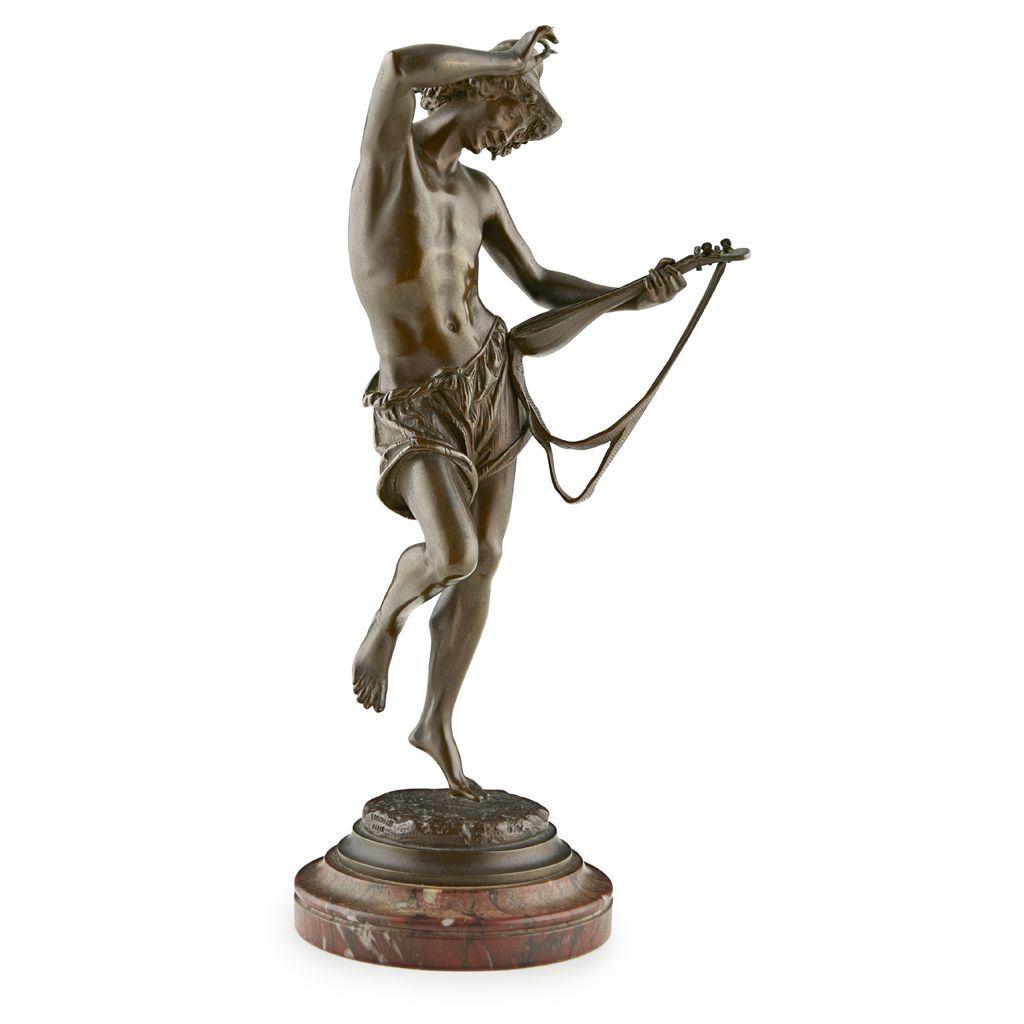 bronze, brown patina, depicting a dancing man playing a lute, signed A. CARRIER, on a red marble base
