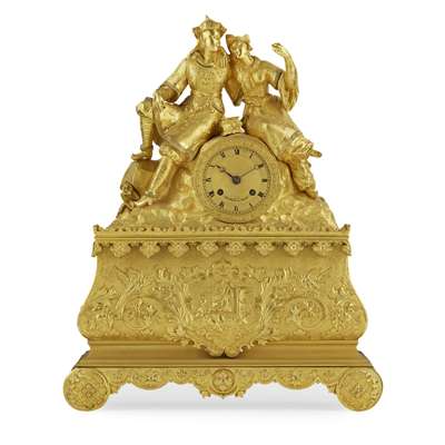 the signed circular gilt dial with Roman numbers set in a rockwork case surmounted by figures of a Malabar man and consort, on a bombe base with Chinoiserie details, the eight-day movement striking a bell