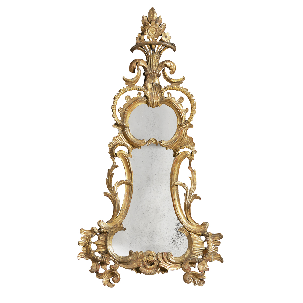 the shaped mirror plate in a pierced and carved frame with C-scrolls and rocaille and a flower-filled basket finial