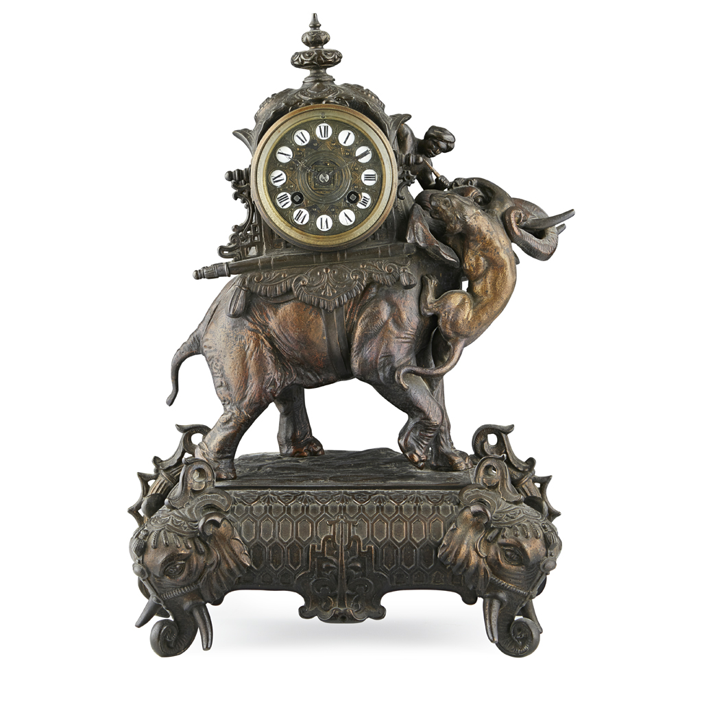 depicting an elephant carrying a howdah being attacked by a lion, with white enamel chapters, raised on base with elephant mask feet, the movement striking a bell