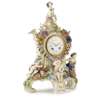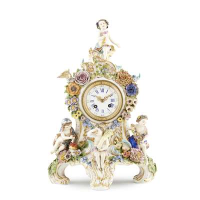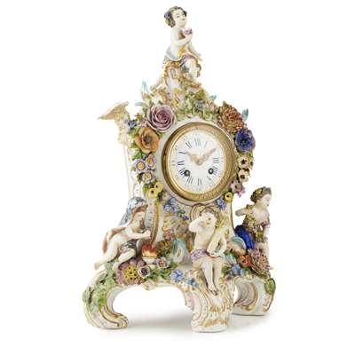 the circular white enamel dial with Roman and Arabic chapters, in a flower encrusted Rococo style porcelain case mounted with four putti emblematic of the Seasons, underglaze blue crowned D mark; the eight-day Lenzkirch movement striking a bell