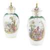 with domed covers above shouldered bodies, with reserves decorated with figures in gardens, flower swags and sprigs and green ground panels, with gilt highlights, underglaze blue AR marks (2)