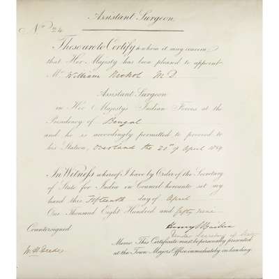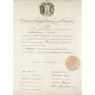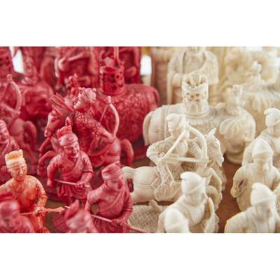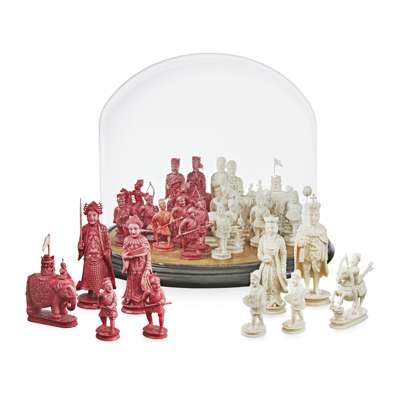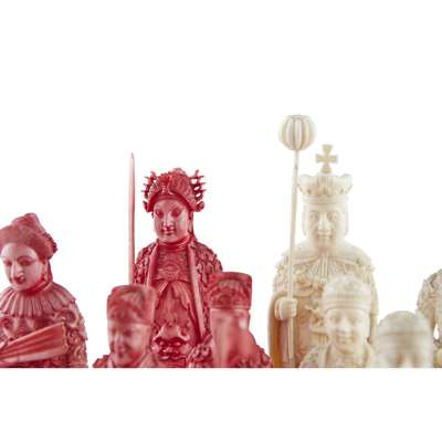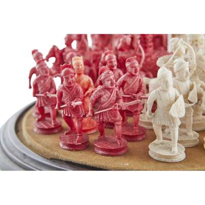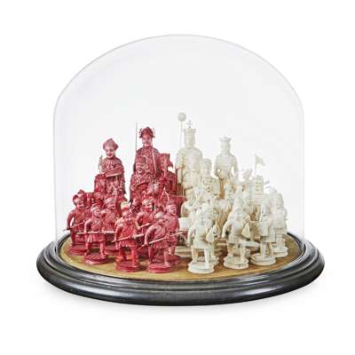 comprising thirty-two pieces (one pawn later replaced), in plain and stained red ivory, depicting Westerners and Asian characters, displayed in a glass dome; with medical diplomas relating to believed previous owner William Nichol, and a certificate appointing him Assistant Surgeon to Her Majesty's Indian Forces, 1859 (qty)