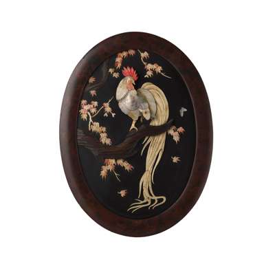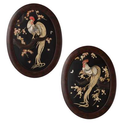 depicting cockerels perched on wood branches in high relief, in stained ivory with mother-of-pearl and abalone, in lacquered oval frames (2)