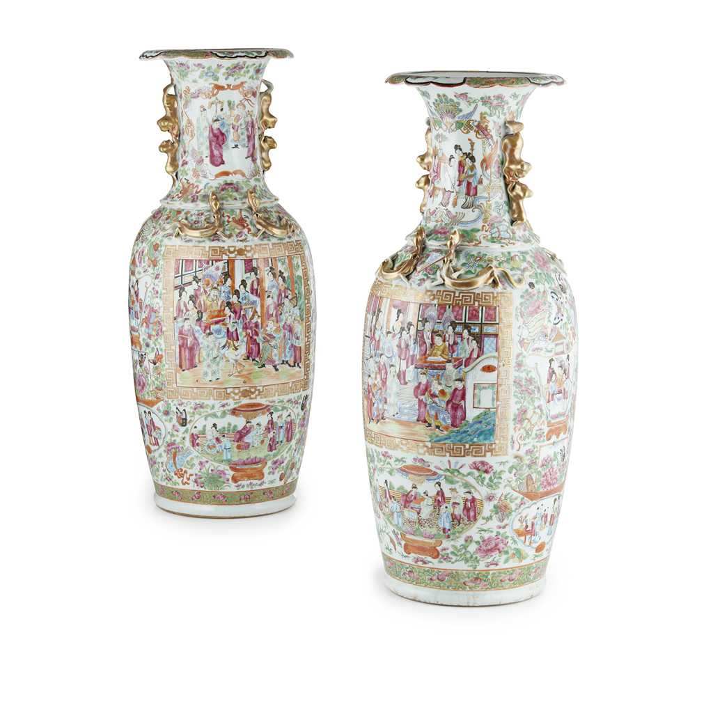 NEAR PAIR OF CANTONESE FAMILLE ROSE VASES