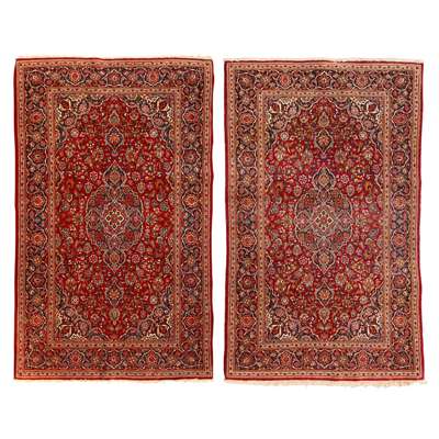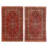 each with red field with indigo medallion, similar spandrels, within indigo palmette and arabesque borders (2)