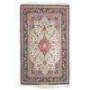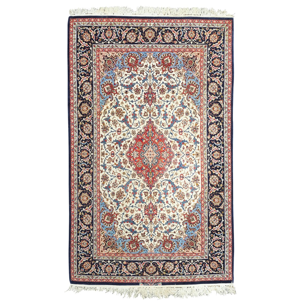 the cream field with red medallion, light blue spandrels, within indigo palmette and arabesque border, inscription to one end