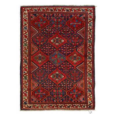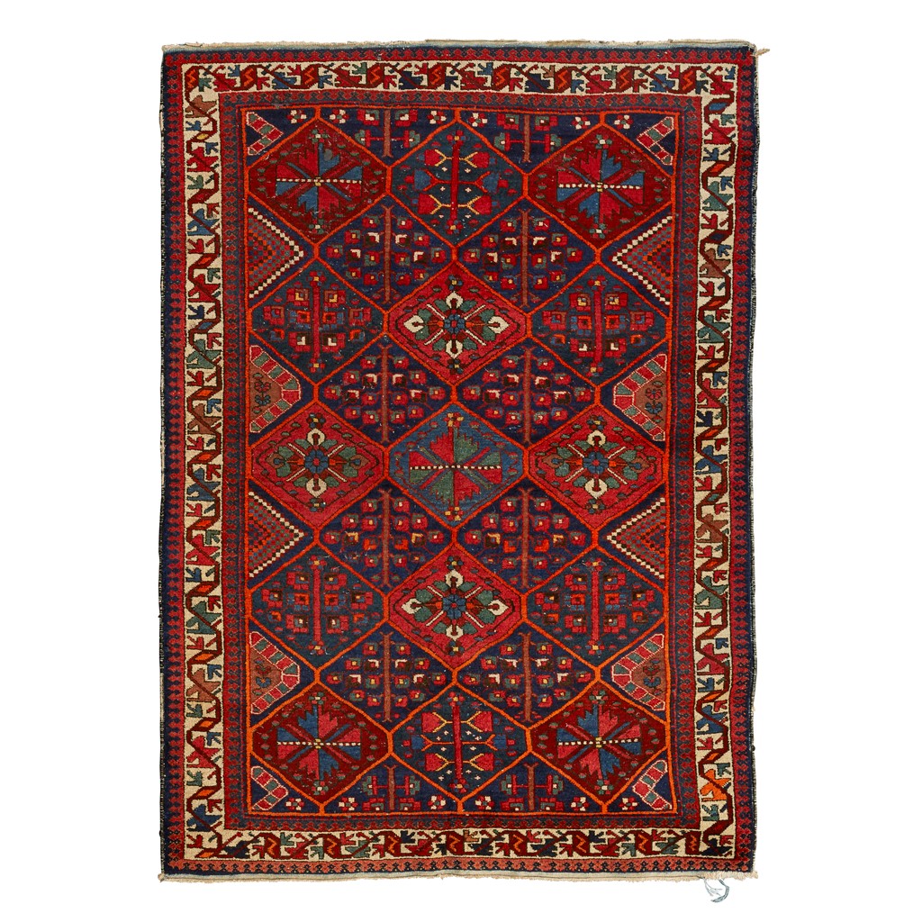 the indigo field with stylised foliate pole lattice, red spandrels, within ivory stylised vine border; and a BAKHTIARI RUG, the field with allover foliate lattice pattern, within ivory stylised vine border (2)