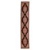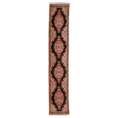 the dark indigo field with four pink floral medallions, within narrow brown palmette and foliate border