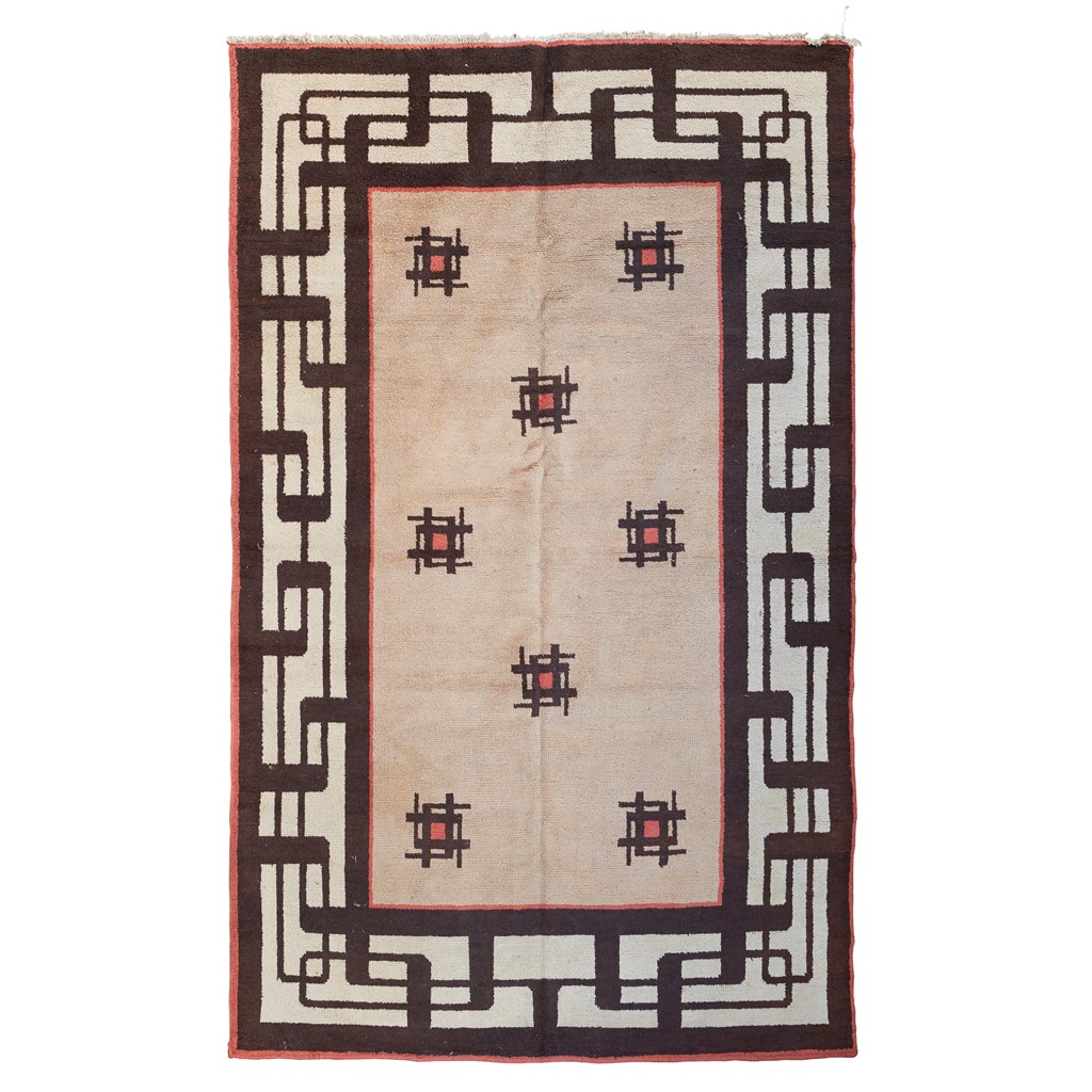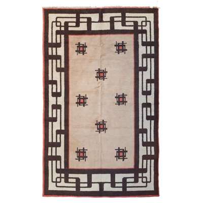 the plain camel field with geometric motifs, within cream and brown geometric border