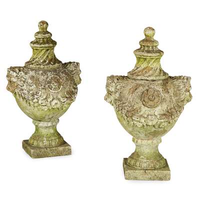 PAIR OF PAINTED TERRACOTTA GARDEN URNS AND COVERS