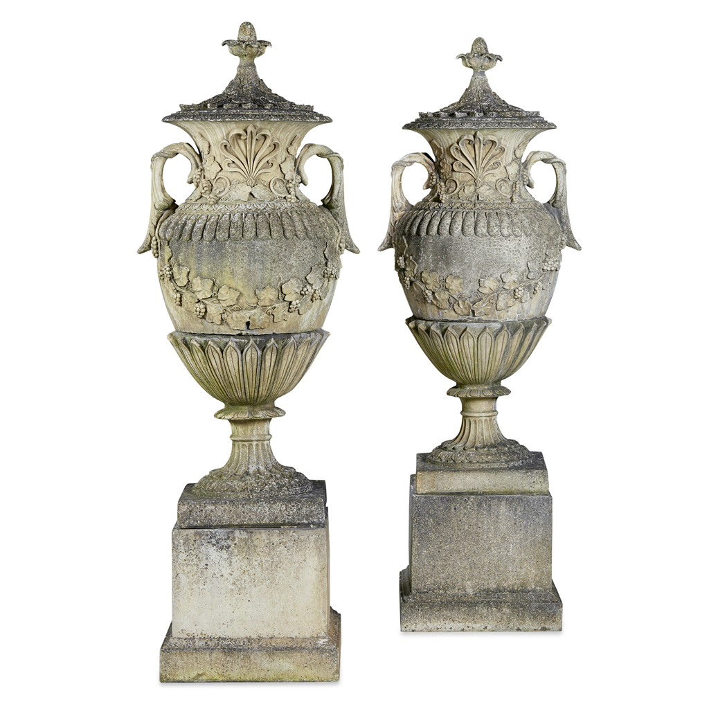 the covers with pine cone finials above bodies with anthemion and fruiting vines with foliate loop handles to the sides, on fluted socles with leaf tip moulded foot, raised on square pedestals (2)
